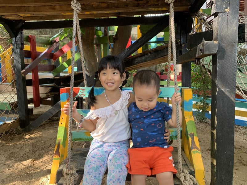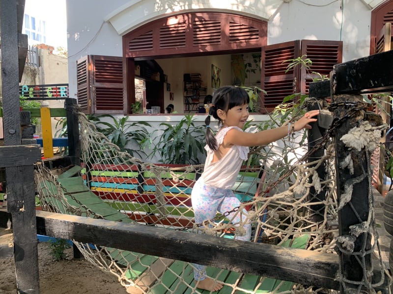 Ngoài ra, Pet Me còn có một sân cát ngoài trời với nhà cây, cầu tuột và xích đu nho nhỏ cho các bé vui chơi cạnh các bạn thú cưng. Đây chính là cách hay tiêu tốn bớt năng lượng của các con để ba mẹ được “ngồi chill” ít phút.