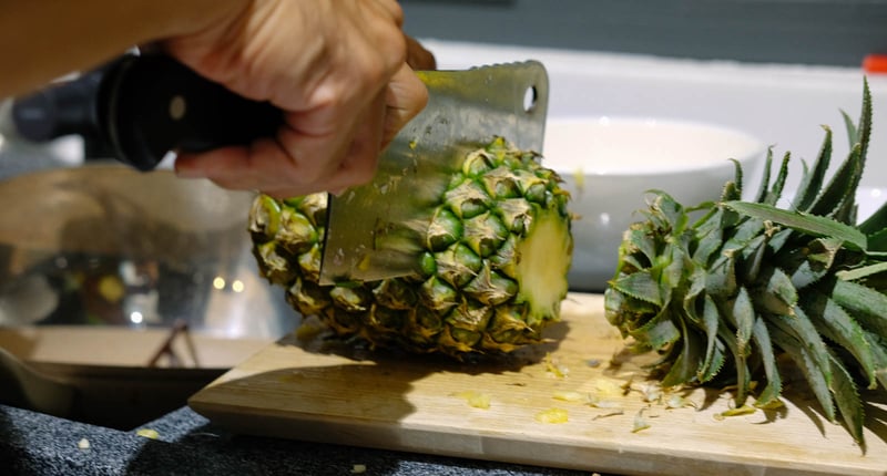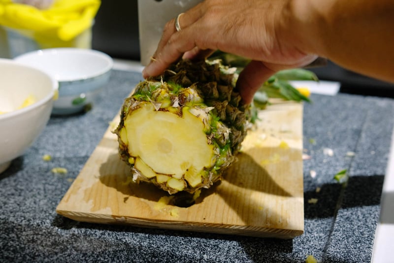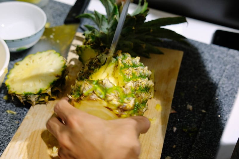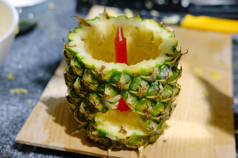 Bước 2: Bạn đặt trái thơm lên thớt và cắt 1/3 thân thơm từ cuống lá xuống để làm nắp đậy. Sau đó, bạn dùng dao lưỡi nhọn khoét lấy thịt bên trong trái thơm, tạo thành chỗ trống để đặt nến. Lưu ý, phần đáy bên trong trái thơm nên khoét cho bằng phẳng một chút để đặt nến cho vững.