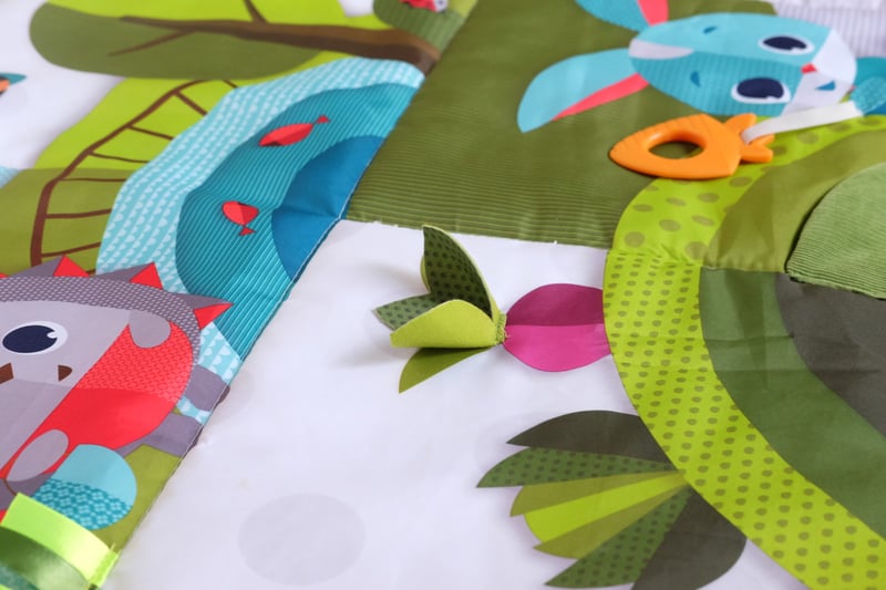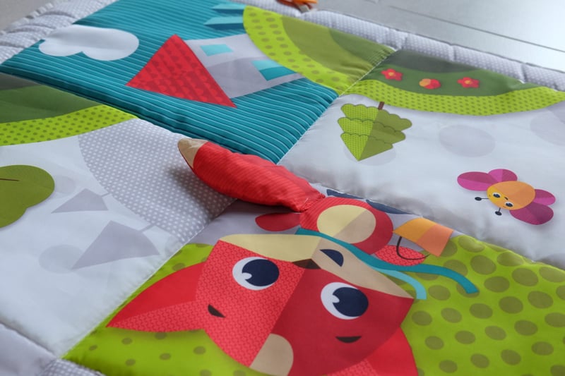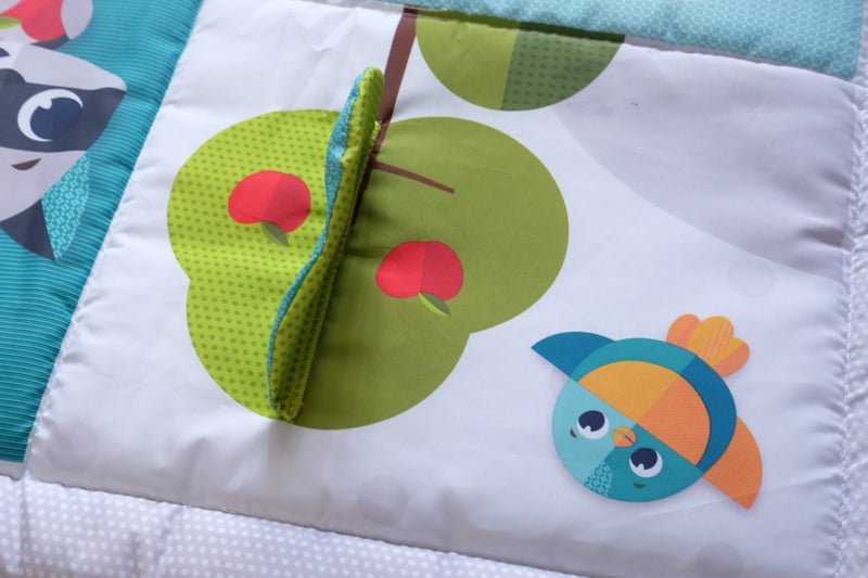 Thảm đính kèm nhiều món đồ chơi sáng taọ như đuôi cáo để bé mỗi khi tập gậm phát ra âm thanh loạt xoạt, gương bọc vải để bé khám phá biểu cảm gương mặt mình, cà rốt silion tập gậm nướu, túi nhỏ chơi trò tìm kiếm kho báu, những dãy ruy băng mềm mại để bé khám phá nhiều chất liệu mới…