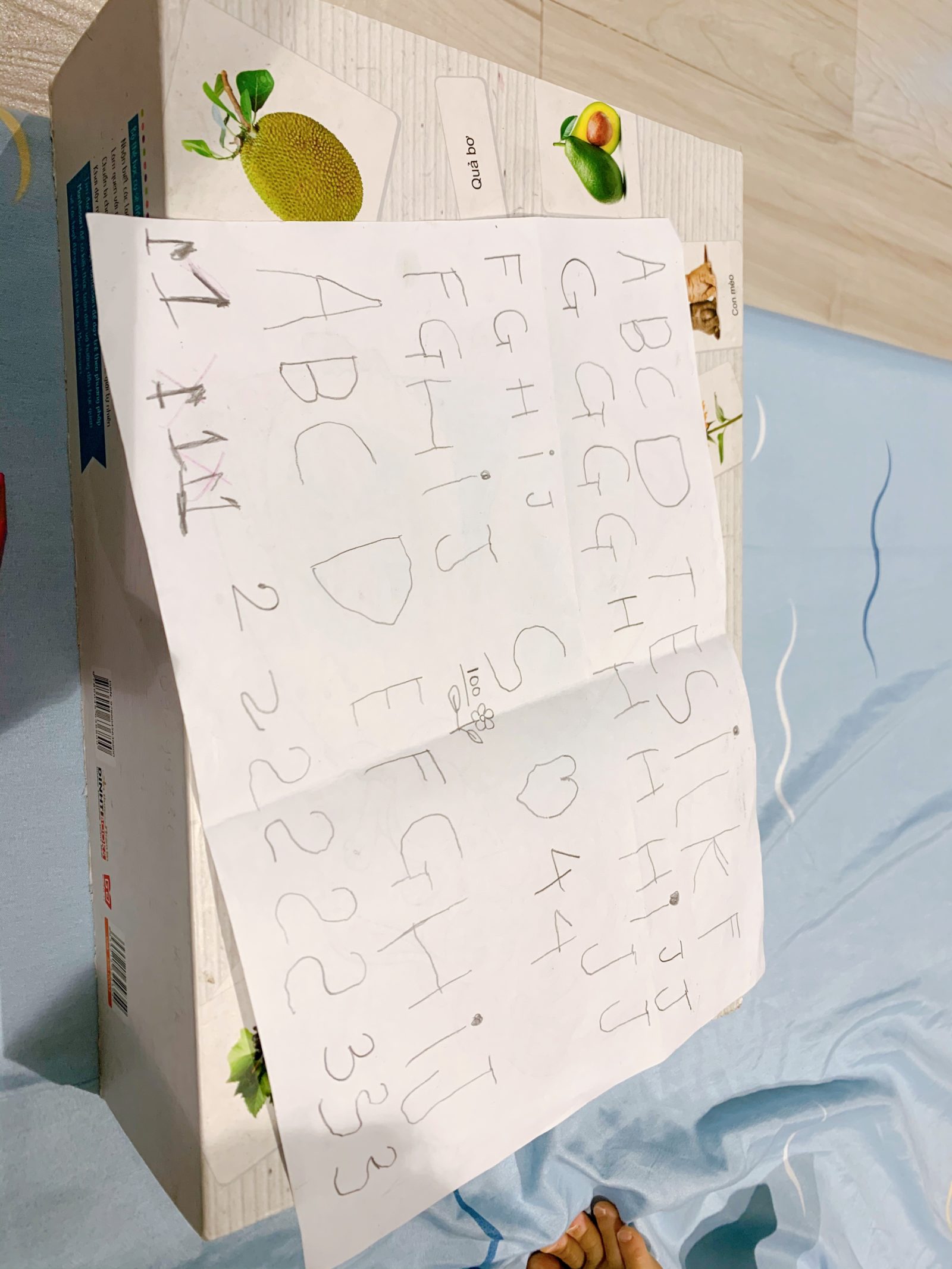 Ví dụ, khi học chữ cái A, mình viết mẫu cho con đầu tiên rồi bắt Silk viết lại 3 dòng cho quen tay viết đẹp và nhớ mặt chữ. Mỗi ngày mình cho con học 5 chữ cái thôi. Cuối buổi, ôn lại nếu con nhớ và viết đúng hết những chữ đã học, mình ghi 10 điểm thật to và thưởng quà nhỏ. Ngày hôm sau, tiếp tục học tiếp 5 chữ cái tiếp theo và đồng thời ôn lại những chữ cái đã học. Đối với số, mẹ Silk cũng làm tương tự. Silk thích lắm, mỗi khi được 10 điểm cười tít mắt, khi quên bài thì cố gắng thêm.