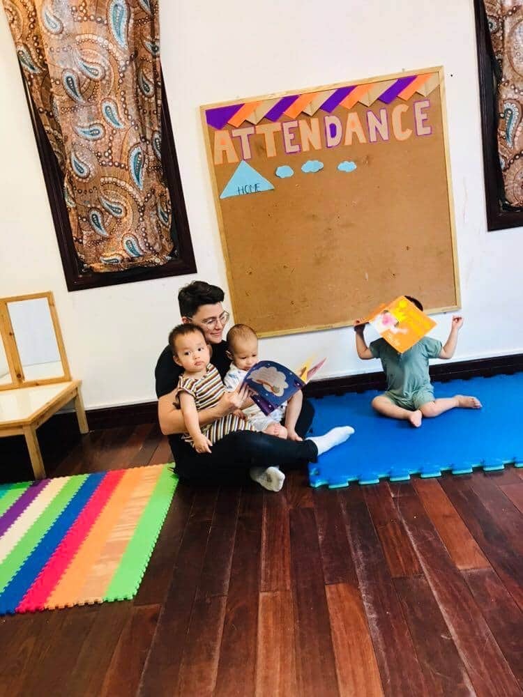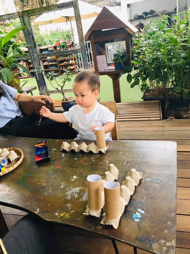 Mỗi ngày mình đều theo dõi lịch hoạt động vui chơi của con. Quinn tập hát, tập múa, học chữ cái abc và số tự nhiên qua các bài hát cùng các bạn. Con còn thoải mái tự do khám phá khu vườn trong trường, ngồi tô màu nước, làm giấy thủ công và vô số trò chơi handmade do các cô nghĩ ra.
