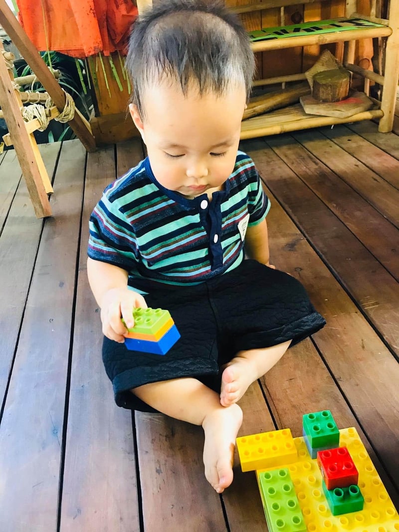 Ngày đầu tiên, ừ 8g-9g sáng mình ngồi chơi thoải mái cùng Quinn trong lớp cùng với cô và các bạn nhỏ. Ban đầu Quinn hơi e dè, ngồi sát trong lòng mình, tò mò quan sát mọi người và cảnh vật xung quanh. Khi thấy đồ chơi mới, em thích thú chạy lại tóm lấy rồi vội vàng quay lại tìm mẹ. Các cô tích cực dần dần làm quen trò chuyện cùng Quinn nhẹ nhàng.