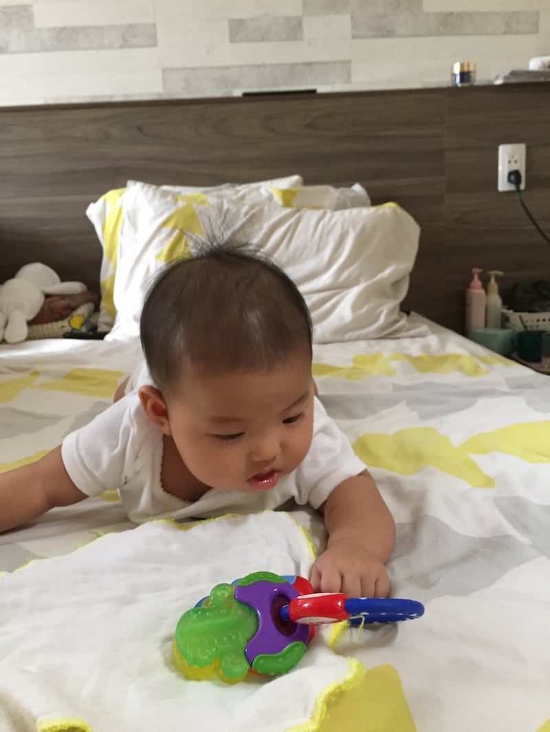 Sau khi biết là tay của mình, Silk bắt đầu cho tay vào miệng ngậm, cạp, liếm, ngắm, làm đủ trò “dị hợm” 😁. Trong khoảng thời gian này, mình tích cực chơi với con hơn, xoay xoay những vật nhiều màu sang trái rồi phải, xa rồi gần. Silk thích thú đạp chân, quơ tay hưởng ứng. Ngoài ra, trước mỗi cử ngủ, mình đều cùng con trò chuyện và đọc truyện tranh. Mình yêu thích khoảng thời gian chơi cùng con.